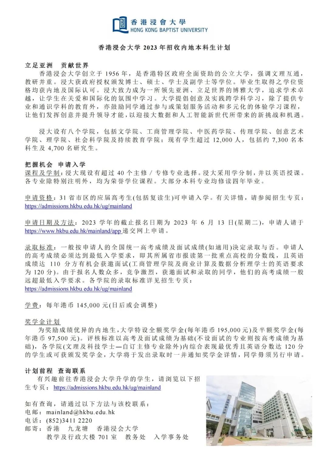 香港浸会大学2023年内地招生信息